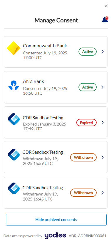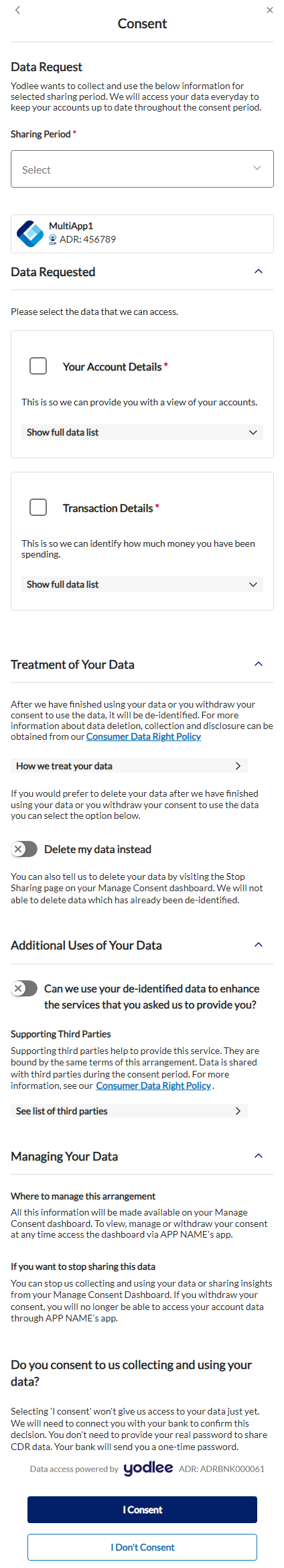 Open Banking (OB) allows users to share their account information with accredited organisations, including Yodlee. Being an unrestricted, active, and Accredited Data Recipient (ADR), Yodlee offers a fully compliant customer consent flow, consent, and data management solution that is easily white-labeled through our unique configuration tool to ensure you and your customers have a seamless experience.