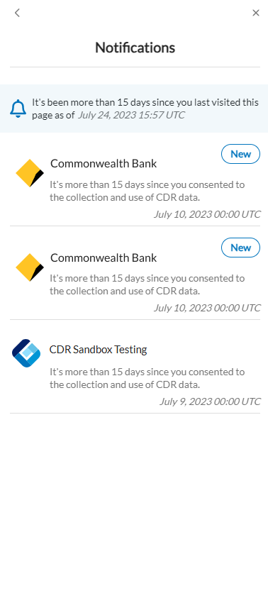 The user is periodically notified of their current Active consent in the notification dashboard to ensure the user is up-to-date. Notifications are displayed based on the prevailing rules for each Active consent.