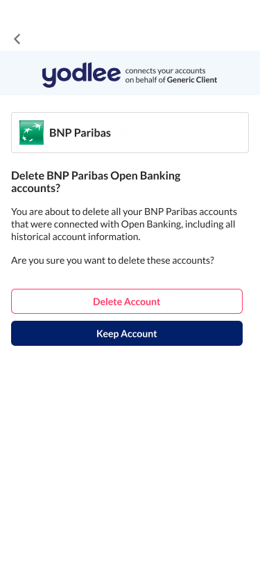 The user can delete consent by tapping the Delete Account, available only on the consent detail screen that can be invoked from the Manage Consent screen. The delete option is available when the consent is active and if the consent has expired or is about to expire. The provider for which consent is deleted will no longer appear in the Manage Consent screen. The financial institution or provider is notified that the user has deleted the consent to share account information.