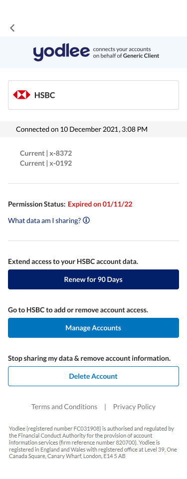 FastLink lets users re-authenticate and renew their authorization to share their account information with Yodlee. The user can invoke the consent renewal flow by invoking the Manage Consent screen and selecting the required consent from the listed consents. The consent status applicable at that moment is displayed against each listed consent.